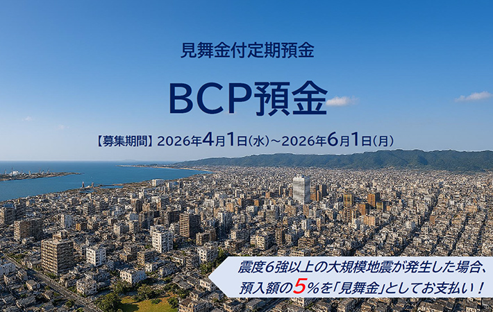 震度6強以上の大規模地震が発生した場合、預入額の5%を「見舞金」としてお支払い!見舞金付定期預金「BCP預金」取扱開始!募集期間:2026年4月1日(水)~2026年6月1日(月)