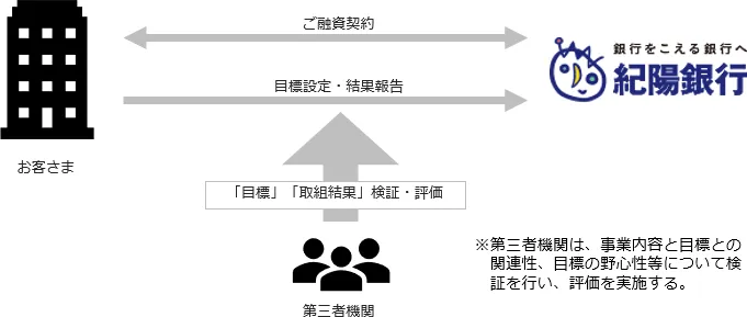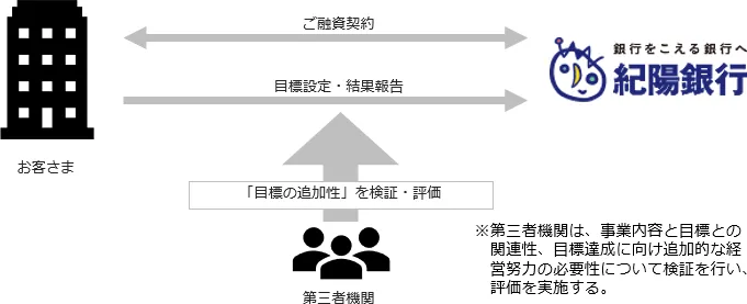 紀陽サステナビリティ・リンク・ローンは、SDGsに関連する野心的な数値目標を設定し、目標の達成状況に応じて適用金利を変動させる貸出であり、2022年6月より取扱いを開始しました。本商品では、SDGs推進に向けた環境負荷低減に資する野心的な目標を設定し、目標達成に向けた取り組みを対外的に公表することで、お客様のサステナビリティ経営の高度化を進めていくことを目的としています。