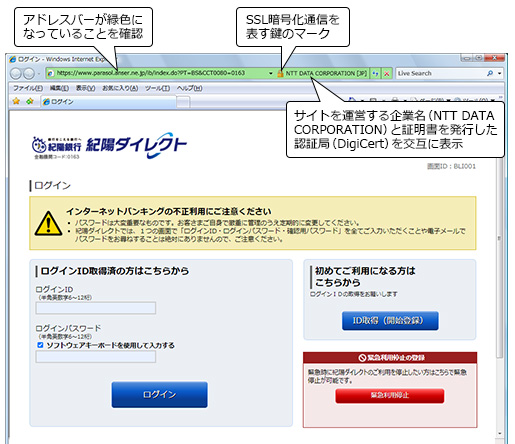 Internet Explorer7.0(以上)では、「ブラウザのアドレスバーの色」と「サイトを運営する企業名の表示」の2点を確認することにより、正当な紀陽銀行のサイトであることを確認できますので、紀陽銀行に見せかけたサイト(フィッシングサイト)を視覚的に簡単に判別できるようになります。